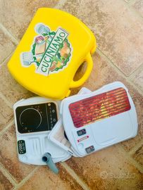 Cucina giocattolo “gran menu” Chicco (anni 2000) in buono stato con set piatti/ pentole/ accessori; altri accessori e altro gioco omaggio in valigia “CUCINIAMO” (con ulteriori attrezzi).