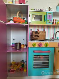 Completa di tantissimi accessori: piatti, bicchieri, pentole, cibo finto, presine, utensili e tutto quello che serve per giocare come in una vera cucina.