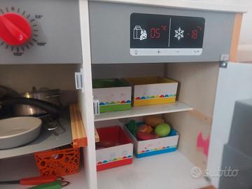 cucina in legno dotata di attrezzi da cucina con luci e suoni ancora funzionanti usata ma ancora in ottimo stato. una cosa che in certi punti il legno è rimasto colorato.