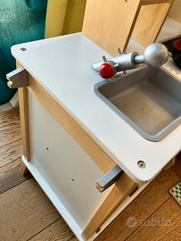 Bellissima cucina in legno per bambini. Completa di stoviglie, pentole, frutta e verdura in legno e plastica carrello per la spesa. Dolci in stoffa e verdure in stoffa, piadine. Hamburger in legno