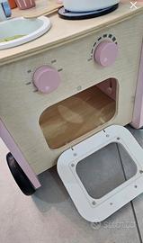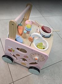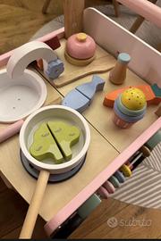 Dotato di piccoli accessori in legno: coltello , paletta , padella, broccolo , carne, pesce , carota e campanello .
