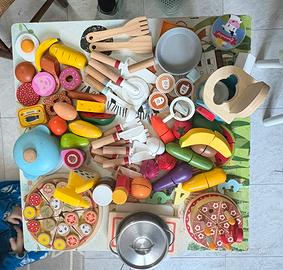 Tra gli accessori, macchina caffe, posate, pentole, frutta e verdira, quasi tutto in legno.