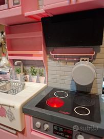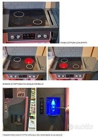 Segue il piano cottura con accensione di 2 fuochi con effetti di frittura e acqua che bolle (pulsanti sul frontalino), sotto il forno e sopra armadietto porta oggetti. Aspiratore e mensola appendi mestoli.