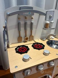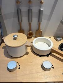 Cucina in legno New Classic Toys compresa di accessori giocattolo: frutta in legno con velcro, stoviglie giocattolo, pentole in legno e pentole in plastica giocattolo. Cucina in ottime condizioni.