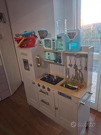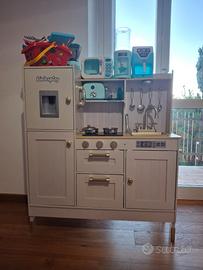 Vendesi cucina in legno per bambini con suoni insieme a tanti utensili e altri giochi come carrozzina, folletto, fornetto, friggitrice, frullatore ecc.