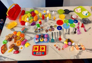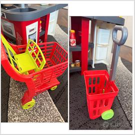 Regalo anche carrello della spesa di plastica rigida e cestello spesa più una marea di accessori cucina (ultima foto) comprati a parte, stoviglie piatti, bicchieri, posate e pentole, cibo di ogni tipo, dolci, salato e frutta.