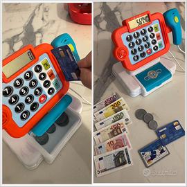 Regalo insieme alla cucina: cassa del supermercato funzionante con calcolatrice e suoni reali, monete, banconote e carte di credito, del valore di 35 euro.
