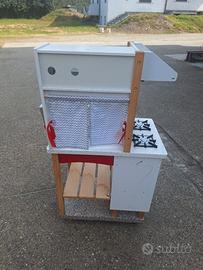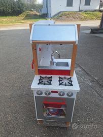 cucina per bambini il legno, con supporto su ruote, comprensiva di utensili quali stoviglie in plastica per bambini NON SPEDISCO
