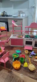 Cucina per casa delle bambole. La cucina è composta da tavolo e 3 sedie, mobile lavandino con cola piatti con sportelli che si aprono, mobile cucina con cappa sportelli forno che si aprono, frigo, e tre mobili a vista, più tantissimi accessori di cucina e pulizia come da foto. Ritiro a mano non spedisco se siete nelle vicinanze posso portare io.