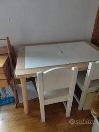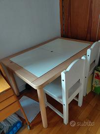 Vendo per conto di mio figlio (6 anni) cucina con attrezzi come in foto, tavolino montessori con due sedie e lavagna con rotolo di carta incluso.
