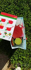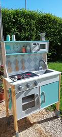Cucinetta giocattolo in legno (forno, ripostiglio, microonde, fornelli, rubinetto ecc.), gadget inclusi (stoviglie di metallo, dolcetti, pentole pasta ecc.)
