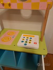 Cucinetta gioco interamente in legno colorato Boikido 3 in uno, su un lato funge da cucinetta con lavello/cassa, fornello e sportelli, dall'altro funge da casetta delle bambole con 4 ambienti.