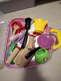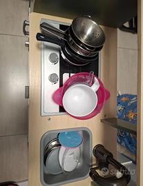 Cucina in legno giocattolo x bambini ben conservata con vari accessori tra piatti posate mangiare in legno tosta pane macchina caffè e altre cose. Possibile spedizione su richiesta a carico della acquirente.