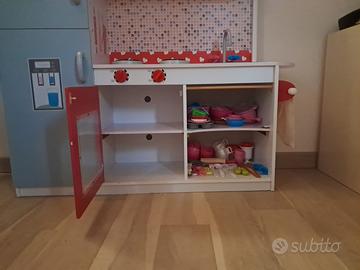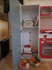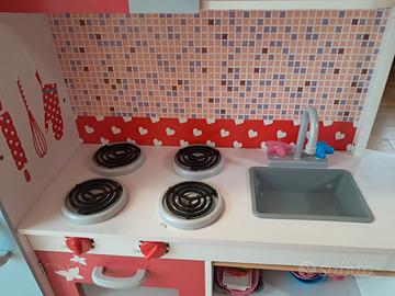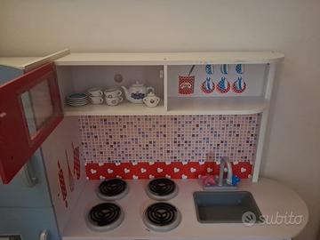 cucina giocattolo in legno: altezza 100 cm, lunghezza 100 cm, profondità 30 cm. Dotata di frigorifero, forno, lavello, dispensa, forno microonde. Insieme regalo anche numerosi oggetti: posate, cibo giocattolo, piatti, bicchieri, set da tè in ceramica Peppa Pig e set gelato in legno