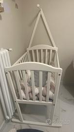 Culla a dondolo in legno bianca con bastone per tenda a baldacchino.