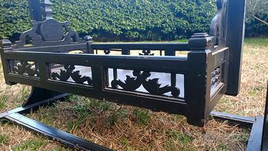 Culla a dondolo in legno di probabile origine indiana usata originariamente per addormentare i nostri bimbi ed in seguito come complemento di arredo, vendiamo per inutilizzo. Mancano alcune delle decorazioni in legno sui lati, alcuni sbecchi sulla vernice, facilmente rimediabili.Solo ritiro a mano.