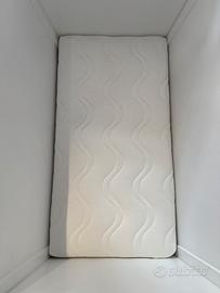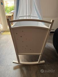 Culla a dondolo di colore bianco con piccole stelline argento all’esterno lato testa e lato piedi completo di materasso. Il materasso presenta il suo scatolo originale , assente inveve quello della culla. Da un lato del materasso sono presenti piccole macchie ingiallite. La culla è nuova, usata pochissimo. Il baldacchino (o tendina) è stata aggiunta successivamente, è rimovibile e acquistabile separatamente