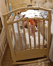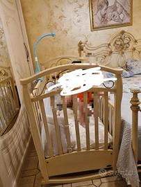 Vendesi culla a dondolo colore avorio in legno decorato usata pochissime volte in ottime condizioni con due cassettoni e completa di accessori