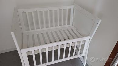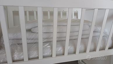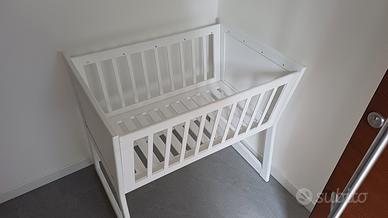 Culla in legno per neonato realizzata su misura, completa di materasso e cuscini laterali di protezione. Una sponda può essere abbassata con un semplice meccanismo. Dimensioni 50x90cm, altezza del piano culla 50cm da terra.
