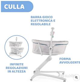 la culla ha moltissime funzioni ed è comodissima per le rotelle che permettono uno spostamento silenzioso, per i piccolissimi durante la nanna, da una stanza ad un altra Senza difficoltà. passa attraverso tutte le porte con semplicità e i livelli di altezza li decidi tu e non sono prestabiliti, questo ti permette di sfruttarla in tantissime occasioni, tavolo, letto, divano, ecc ecc ho anche due materassini di cui uno nuovo. ci sono solo due aloni di usura ma è stata tenuta benissimo. per tutte le informazioni scrivetemi in privato