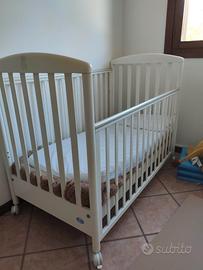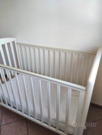 Culla in buono stato bianca. Le spondine si possono abbassare per quando il bebè è ancora molto piccolo, e poi alzare quando è più grande. Anche la rete del materasso si può regolare a due altezze diverse. C'è un cassetto sotto e sono presenti delle ruote sotto i piedini.