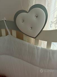 Vendo culla bianca e argento con cuore in pelle bianca e Swarovski in ottimo stato. Pagata 600 € vendo a 50€. Completa di paracolpi a completo e copri piumino. Già smontata
