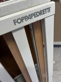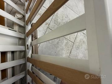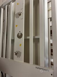 Culla Foppapedretti bianca in legno completa di materasso e cassettone. Presenta alcuni segni di usura e ha una doga mancante.