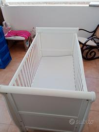 vendo una culla/letto in legno con relativo materassino , un box (come da foto) , 2 oggetti da bagno e un seggiolino da tavolo,
