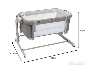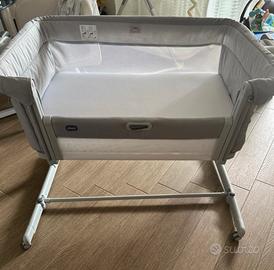 Next to me con Modalità Dondolo, Spondina Apribile, Livelli di Altezza, Altezza Regolabile, 4 Ruote, Materasso, usata circa 4 settimane, acquistata ad ottobre 2024 usata il mese di marzo , conservata in ottimo stato , come nuova nella scatola originale.