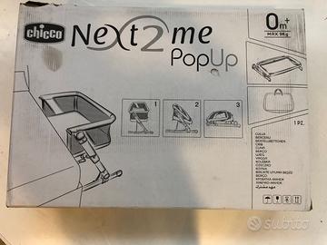 Culla Chicco Next2me Pop-up. Si chiude facilmente, senza smontare nessun pezzo, da portare anche in viaggio perchè occupa poco posto. Completa di accessori e scatola.