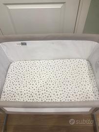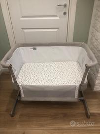 Culla Co-sleeping della Janè in buone condizioni. Si adatta a qualunque letto grazie ai suoi piedi telescopici e le 6 posizioni di altezza. Babyside si puó utilizzare anche come culla indipendente alzando il laterale. Facile da spostare grazie alle 4 ruote indipendenti con freno. Dimensioni: 92x67x68/79cm