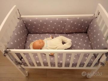 Culla Co-Sleeping Lella Picci Bianca con materasso e set rivestimento tessile composto da quattro pezzi: piumino, federa, paracolpi e coprimaterasso in jersey, il tutto grigio con stelline bianche (unisex).