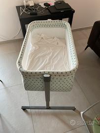 La culla ha un'apertura laterale che consente la presa del bambino, senza alzarsi dal letto: funzione molto comoda durante l'allattamento.