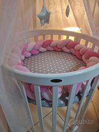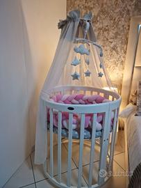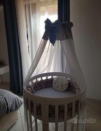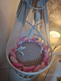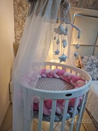 Culla fino a 7 configurazioni e regolabile fino a 5 livelli di altezza. Trasformabile in un lettino tradizionale. Viene venduta con tutti gli accessori Materassino grande e piccolo, lenzuolo grande e piccolo, coprimaterasso grande e piccolo, Set da biancheria per letti ovali: Paracolpi (nuovi mai usati) , cuscini, coperte, fodere per cuscini, asta baldacchino e baldacchino con fiocco. Il colore è grigio. Inoltre regalo treccia paracolpi rosa oppure grigia. Per qualsiasi info contattatemi al 3406849189 Per vedere tutte le configurazioni basta andare sul sito di comfort baby. Ritiro e visione sia a Maddaloni che Casavatore
