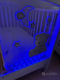 La culla ha un sistema di luci a led gestibile da app il materasso è compreso ed pari al nuovo dispone anche di un ampio cassetto molto utile