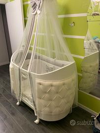 Vendo culla come nuova usata pochissimo bianca con imbottitura bianca trapuntata e con Swarovski completa di velo sopra e paracolpi .