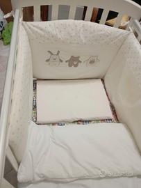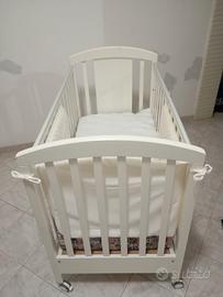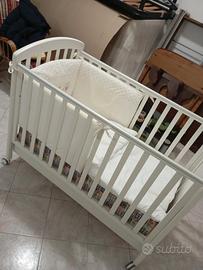 Vendo culla (marca Cuoricini) completa di materasso, cuscino, paracolpi, piumino, coprimaterasso, compricuscini e lenzuola estive e invernali. Dotata di sbarre laterali regolabili su e giu, rotelle e mobiletto estraibile. Larghezza 130cm Altezza 100cm Profondità 68cm Il tutto a 150€.