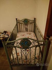 Culla d'epoca in ferro battuto, caratterizzata da un delicato colore verde chiaro e eleganti decori floreali dipinti a mano sulle testate. Stile: Vintage, ferro battuto. Colore: Verde chiaro con decori floreali. Incluso: Materasso con fodera fantasia (come visibile nelle foto) e velo. Ritiro a carico dell'acquirente.
