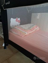 Vendo culla da campeggio nuova con personaggio di Hello Kitty, colore blu, ancora con etichetta. Materasso alto acquistato a parte e pagato 50 euro, anch'esso nuovo. Dotata di sacca e scatola originale.
