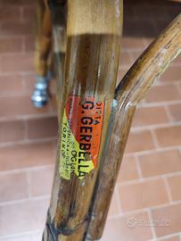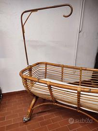 Culla originale anni '60-'70 di robusto bambu', acquistata presso il negozio Gerbella Oglina di Porta Palazzo a Torino, come dimostra l’adesivo ancora presente. Misure 100 x 60 , altezza 62 cm. Bastone altezza 60 lunghezza 55 cm. Completa di materassino e rivestimento interno leggermente imbottito a cui si aggancia un ricco volant di piquet di cotone bianco, smerlato di rosso e decorato con margheritine ricamate a mano. Dello stesso tessuto e ricamo anche il velo che ricopre la culla (vedere penultima e ultima foto). Viste le dimensioni e' possibile solo una consegna a mano a Torino e dintorni