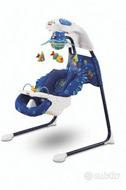 Culla il bambino con 2 diversi movimenti oscillatori, suoni e spattacoli acquatici ! 6 velocità, 8 melodie, 3 suoni della natura. Oscillazioni attivabili: frontalmente (altalena) e lateralmente (culla). 2 posizioni per il seggiolino (diritto/inclinato). Giostrina Acquario con 4 peluche che diffonde luci rilassanti. Ripiano dei giochi removibile. Tasca portagiochi e accessori nella parte posteriore del telaio. Chiusura compatta per il trasporto. Cintura di ritenuta in 3 punti. Imbottitura lavabile in lavatrice. Funziona con 4 pile "D" non icluse.