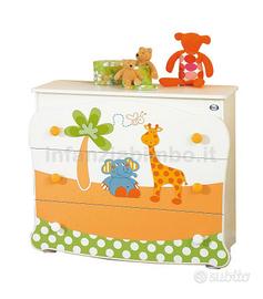 Culla poco più grande di una culla normale, con cassetto, baldacchino,paracolpi e copriletto con piumoncino, più cassettiera con 3 cassetti più grande di un fasciatoio.