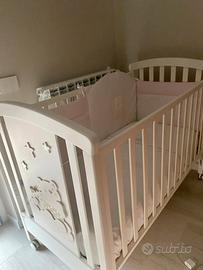 Vendo culla Erbesy bianca in ottime condizioni con cassettone ruote per spostarla e basse che si abbassano all’occorrnza, materasso nuovo in aloe vera, il prezzo si intende culla e materasso possibilita’ di aggiungere anche paracolpi e piumone con disegno in rosa aggiungendo soli 50,00 al prezzo della culla