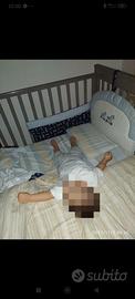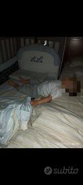 culla fianco letto in legno, robusta. si può calare la sponda sia abbassata che a scomparsa per attaccarla al letto, è regolabile in altezza. color grigio adatta da 0 ai 3 anni.