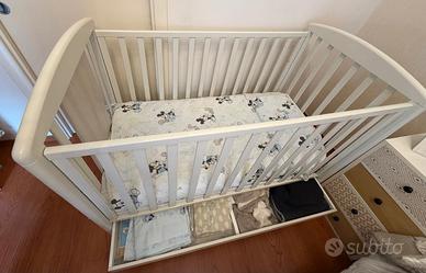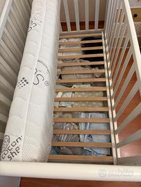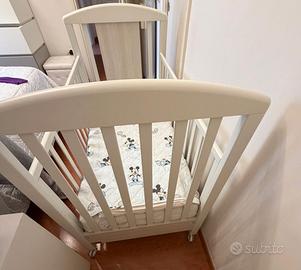 Culla della Foppa Pedretti in legno, con doghe in legno e cassettone, completa di materasso con fodera intercambiabile, cuscino e paracolpi, con dimensioni 130cmx73cm.