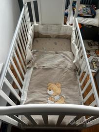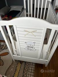 Una testata del lettino è caratterizzata da un tenero decoro, nelle tonalità del grigio, con due dolci orsetti in rilievo e tanti cuoricini. Il lettino ha un ampio cassetto inferiore e 4 ruote piroettanti, di cui due con freno, per facilitare gli spostamenti.