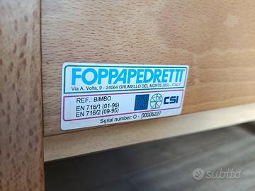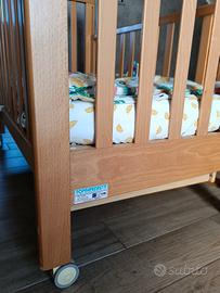 lI lettino in legno naturale di Foppapedretti ha una sponda regolabile a due altezze, un ampio cassetto inferiore, suddiviso in due scomparti, e ruote con sistema frenante, per facilitare gli spostamenti.