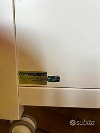 4 ruote gommate piroettanti di cui 2 con freno rendono agevole lo spostamento; ampio cassetto per riporre la biancheria del lettino