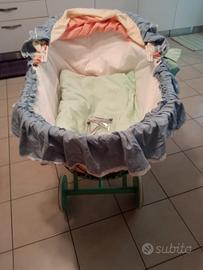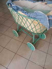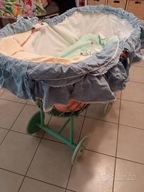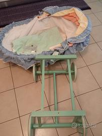 culla in bambù vintage, completa di corredo, materassino e cuscino antisoffocamento. Separabile dal carrello.