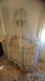 Vendo culla in ferro battuto completa di tutto materasso, cuscino anti soffocamento, copriletto estivo, piumone e un altro cuscino tutti ricamati. Sono da sostituire le ruote